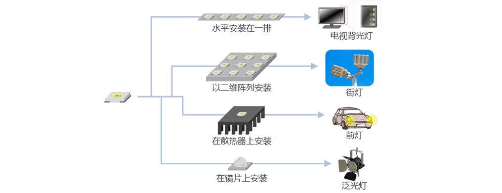 最后一步是“裝配過程”。通過組裝過程,使其成為可應用的產品。 其中有復數LED排列成一行或排列成垂直和水平方向的二維陣列的排列方法。 條形排列用于電視背光和照明,陣列的則用于路燈。此外,通過使用散熱器增強散熱性可用于前燈,而通過透鏡控制光分布則可用于投光器。根據產品不同及用途不同可以實施相應的裝配。