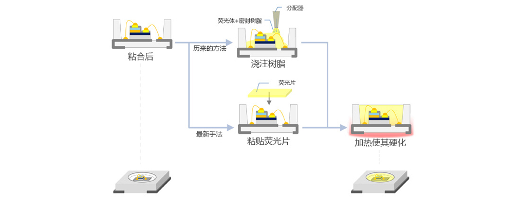 接下來是“包裝”過程。 這是密封熒光體層以使LED變白的過程。 通常,如上圖所示,將可流動狀態的熒光體和密封樹脂澆注在一起,加熱,固化并包裝。 然而為了提高生產率,最近,還使用一種如下圖所示,在附著的片材上用熒光體包裝薄膜的方法。 在白色LED的情況下,會存在當熒光體和密封樹脂聚集時熒光體效率降低的問題。 因此最近,已經嘗試通過使用片狀熒光體進行封裝,來解決該問題,防止這種情況的發生。