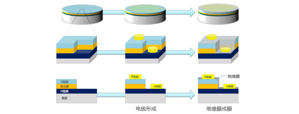 預處理的最后一步是“電極形成”。在此過程中,使沉積層的頂部上形成稱為電極的金屬部件,以使電流流動。 正電極稱為p電極,負電極稱為n電極。 p電極形成在p型層上,n電極形成在n型層上。 在形成電極之后,用絕緣膜覆蓋除電極之外的區域。這具有抑制降低周圍環境的影響并減少在表面上流動的漏電流的效果。 光刻工藝是形成電極和絕緣膜的必要條件,此處就省略不提光刻工藝的詳情了。