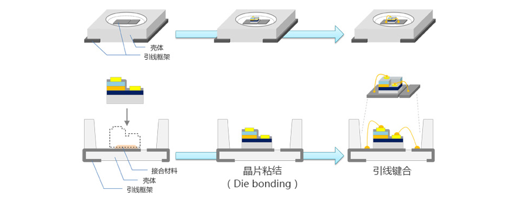 接下來是“粘合”工程。 這是將裸芯片固定到稱為殼體的部件并將其電連接的過程。 由于殼體是絕緣的,電流無法流動,因此引入了用于流動電流的引線框架。 將“粘合”中的芯片鍵合(芯片鍵合),與應用于鍵合構件的殼體以及裸芯片固定,之后將引線框架和裸芯片與導線連接形成可通電的引線鍵合。